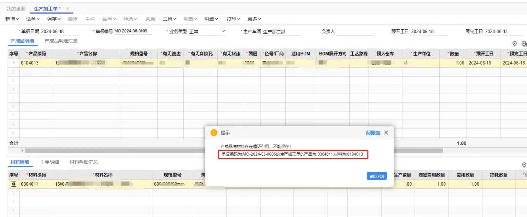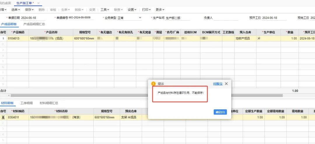 生產(chǎn)加工單保存提示:產(chǎn)成品與材料存在循環(huán)引用,不能保存!
