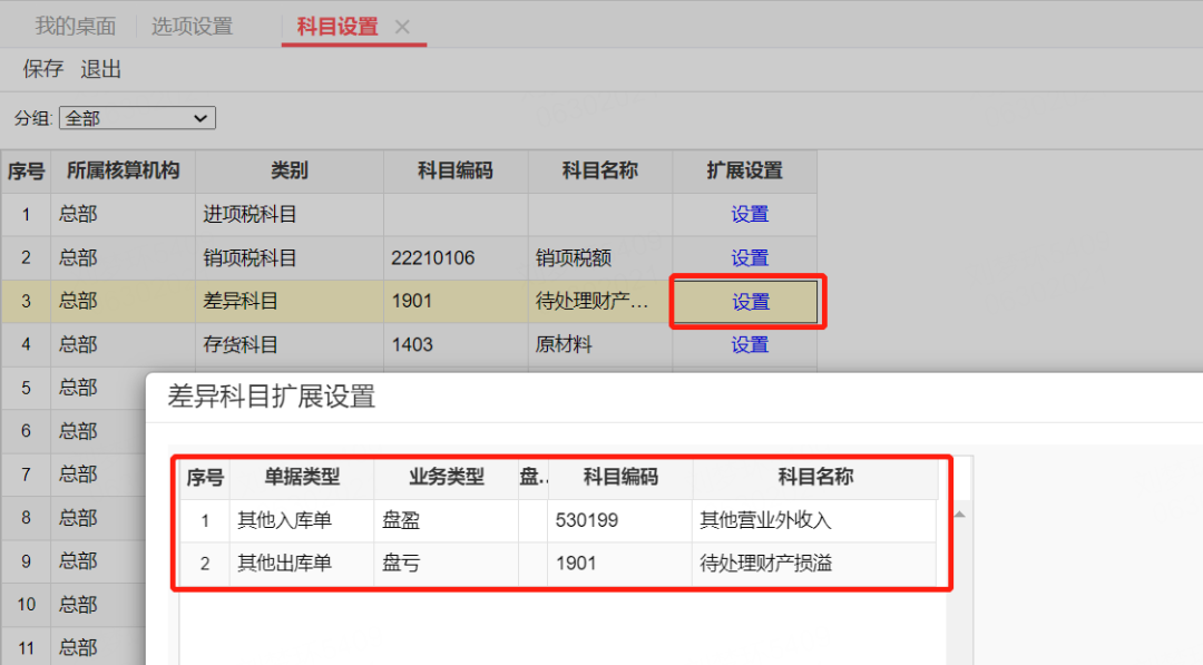 2、在【總賬】-【科目設置】中找到【差異科目】,即可設置盤盈的其他入庫單和盤虧業(yè)務類型的其他出庫單生憑證對應的科目(不啟用選項設置的情況下,差異科目中選不到盤盈盤虧業(yè)務類型)